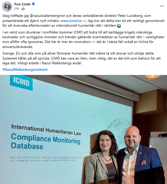 “Today I met with @raoulwallenberginst and their Executive Director Peter Lundberg, who presented a bold new initiative: www.icmd.se — I believe this could become a real breakthrough for monitoring compliance with international humanitarian law worldwide 🌍